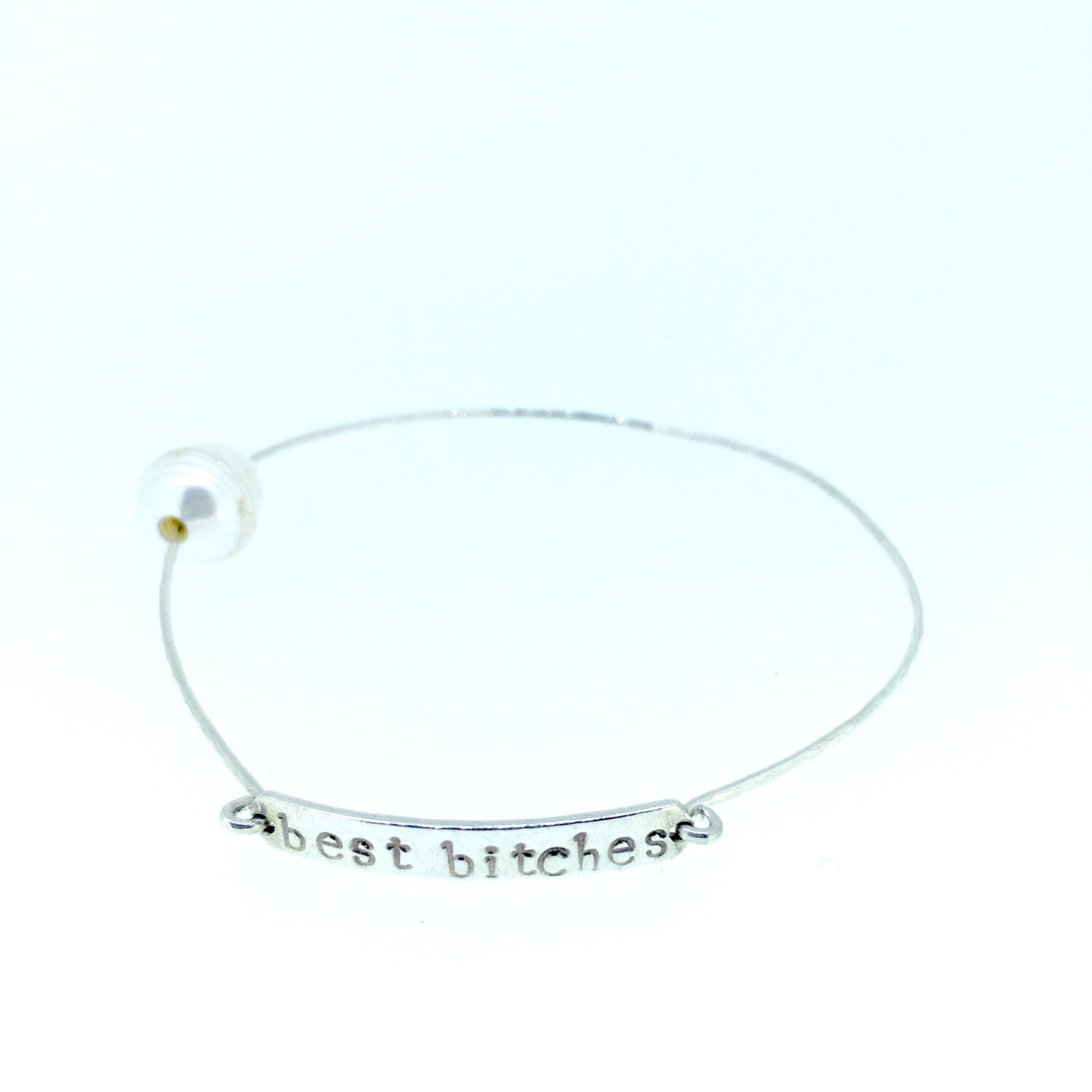 A sassy way to share the love you have for your besties.. Made with a delicate thin18 gauge (material of your choice) hand hammered wire, sterling silver hand stamped plate and accented with a natural baroque Pearl. Pictured: Sterling Silver