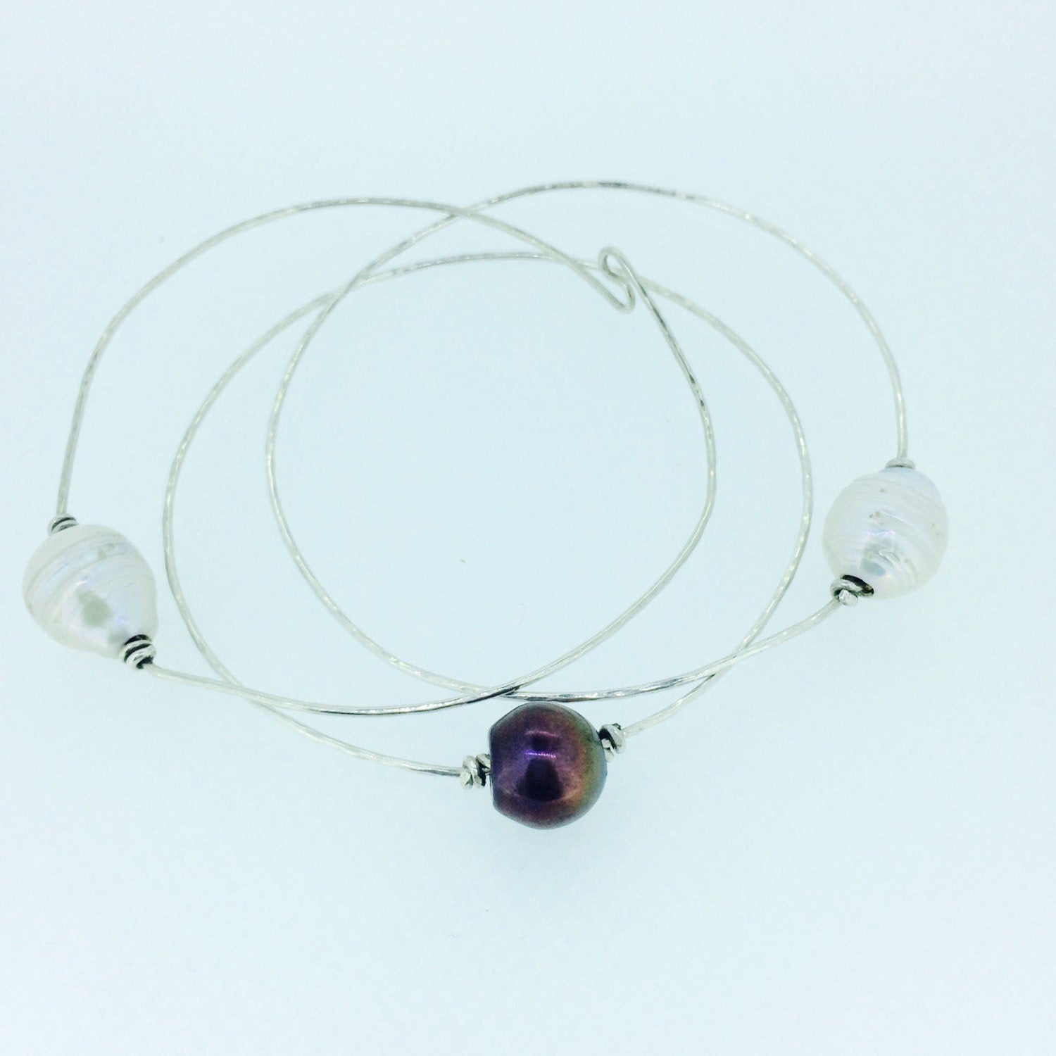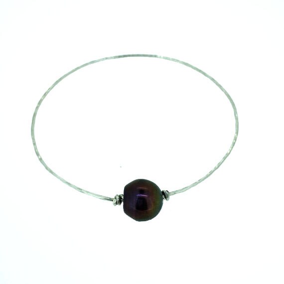 This bangle is perfect to be worn in multiples. Stack them with our baroquel, Akoya white pearl or even your own bracelets. Each bangle is hand hammered with 18 gauge wire. Pictured: Sterling Silver