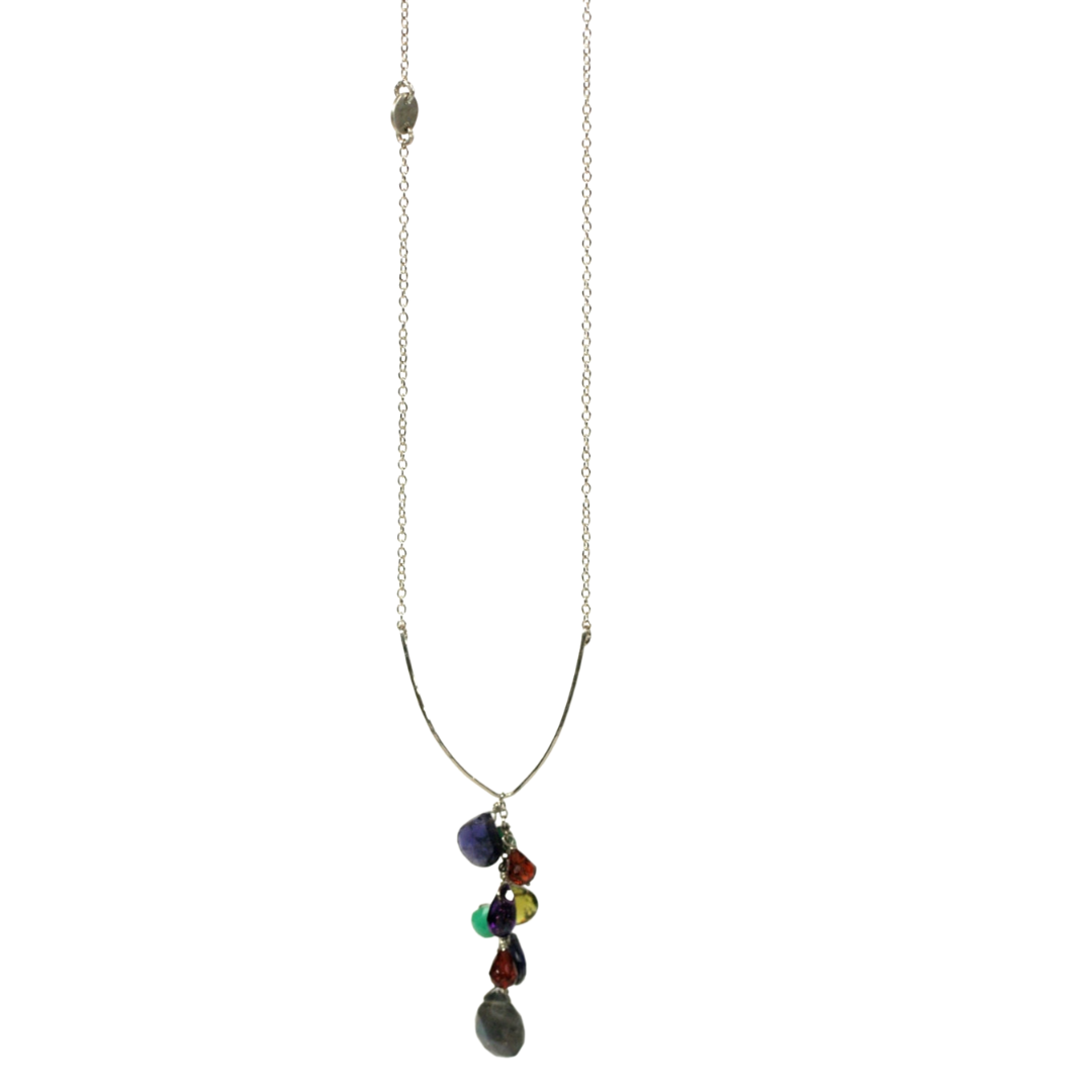 This beautiful lucky horse shoe necklace is made with a brilliant assortment of gemstones. It can be paired with a variety of colors and can be worn casually or dressed up. Hand hammered sterling silver disc lays a few inches about cluster and can be personalized with an initial. Sterling silver chain measures 26".