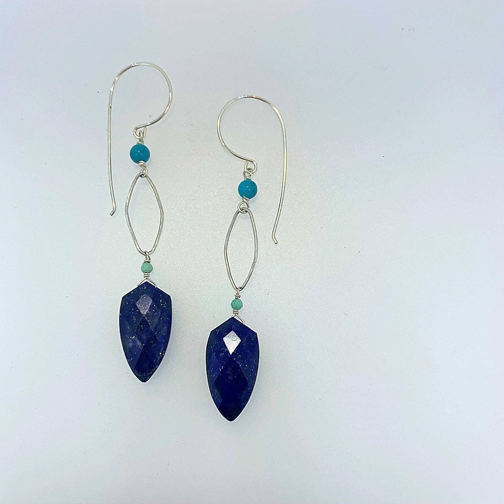 These earrings are made with lapis and tiny turquoise on sterling silver. The length of the earrings measure 2.50 inches.