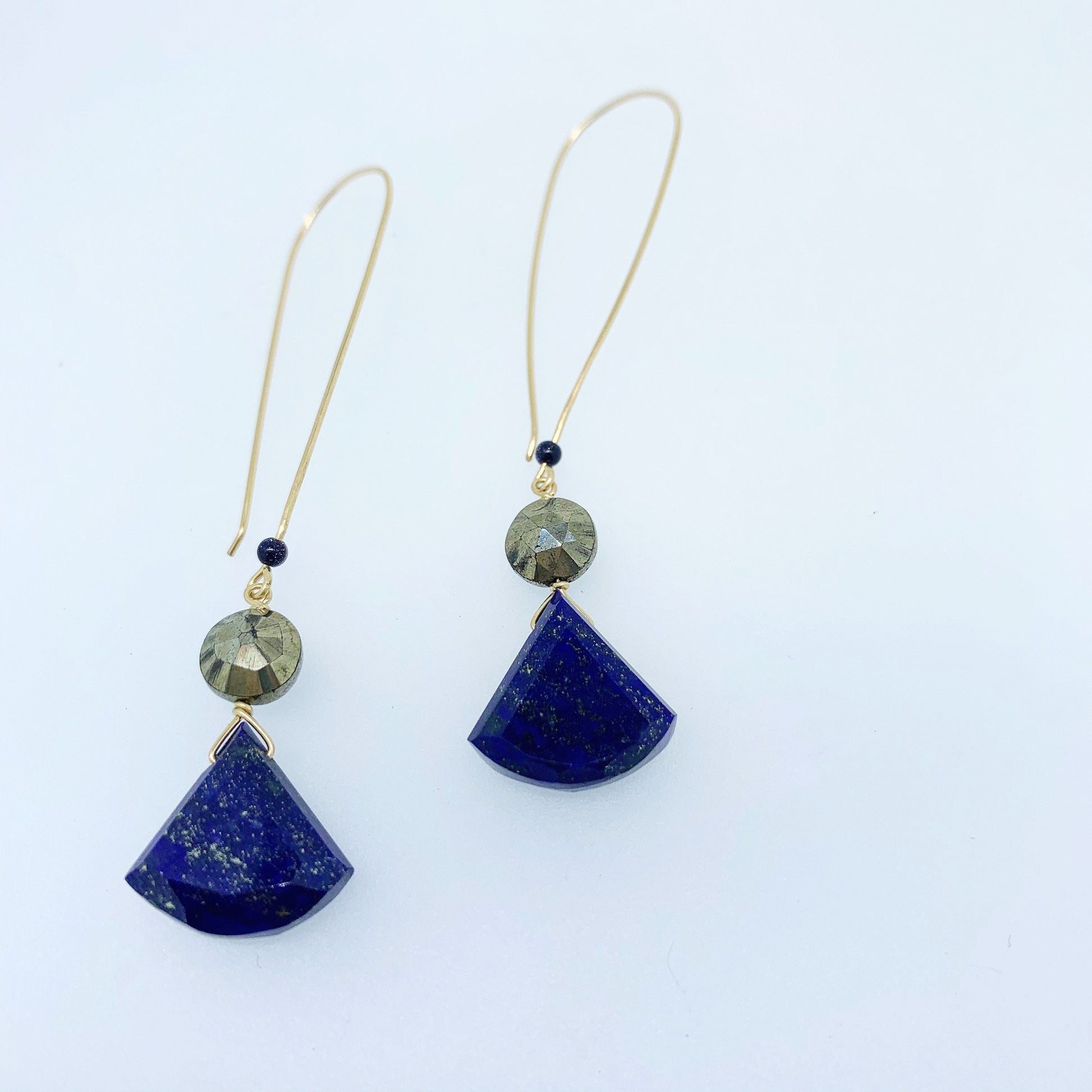 These earrings are made with lapis and faceted pyrite. Earrings are approximately 2.25 inches long. Pictured: 14K Gold filled wire.