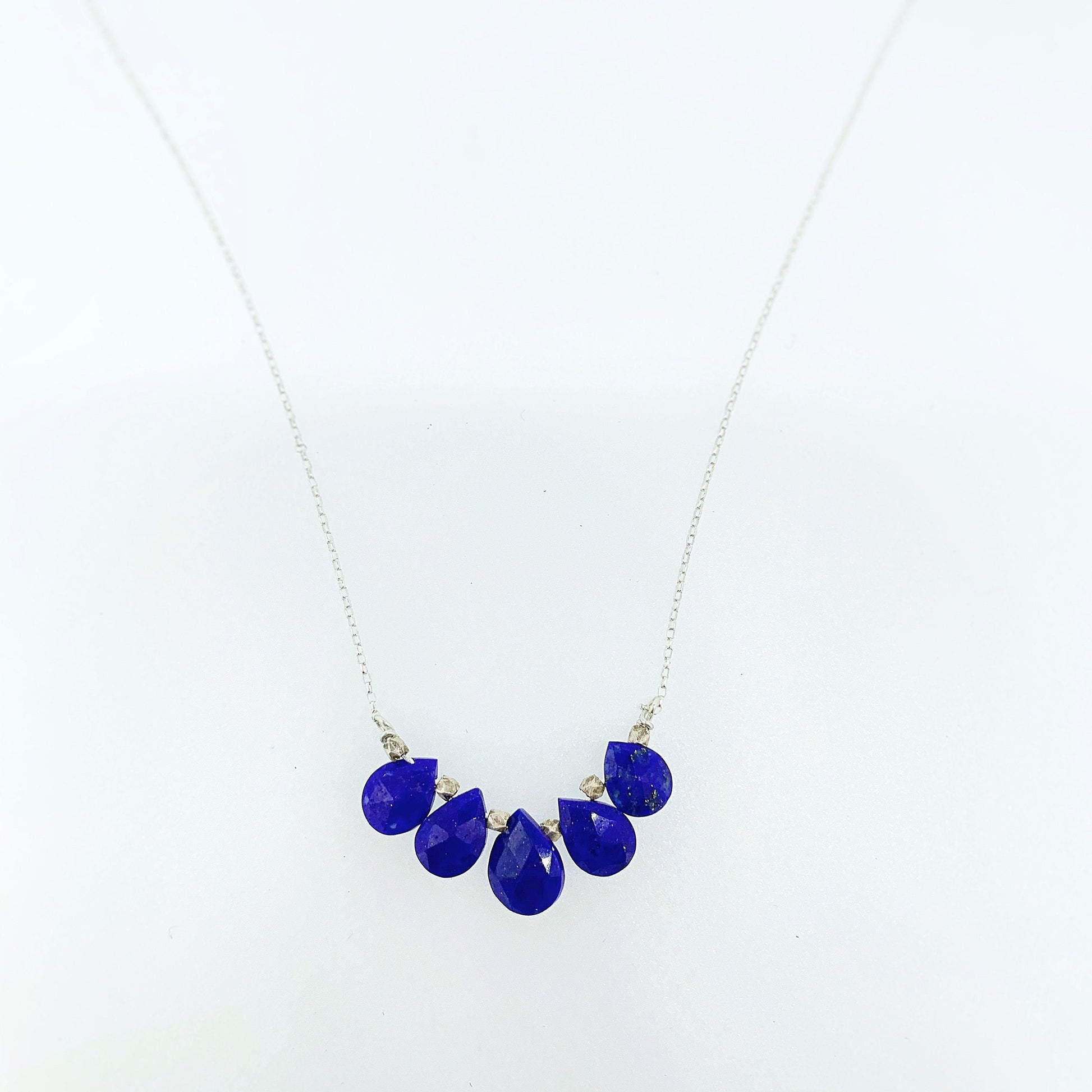 This necklace is made with five small lapis pear shape drops that create an elegant arch. The stones each measure 1/4 inch and the length of the arch 1.25” long. The chain has an adjustable clasp 16-18”. Pictured: Sterling Silver