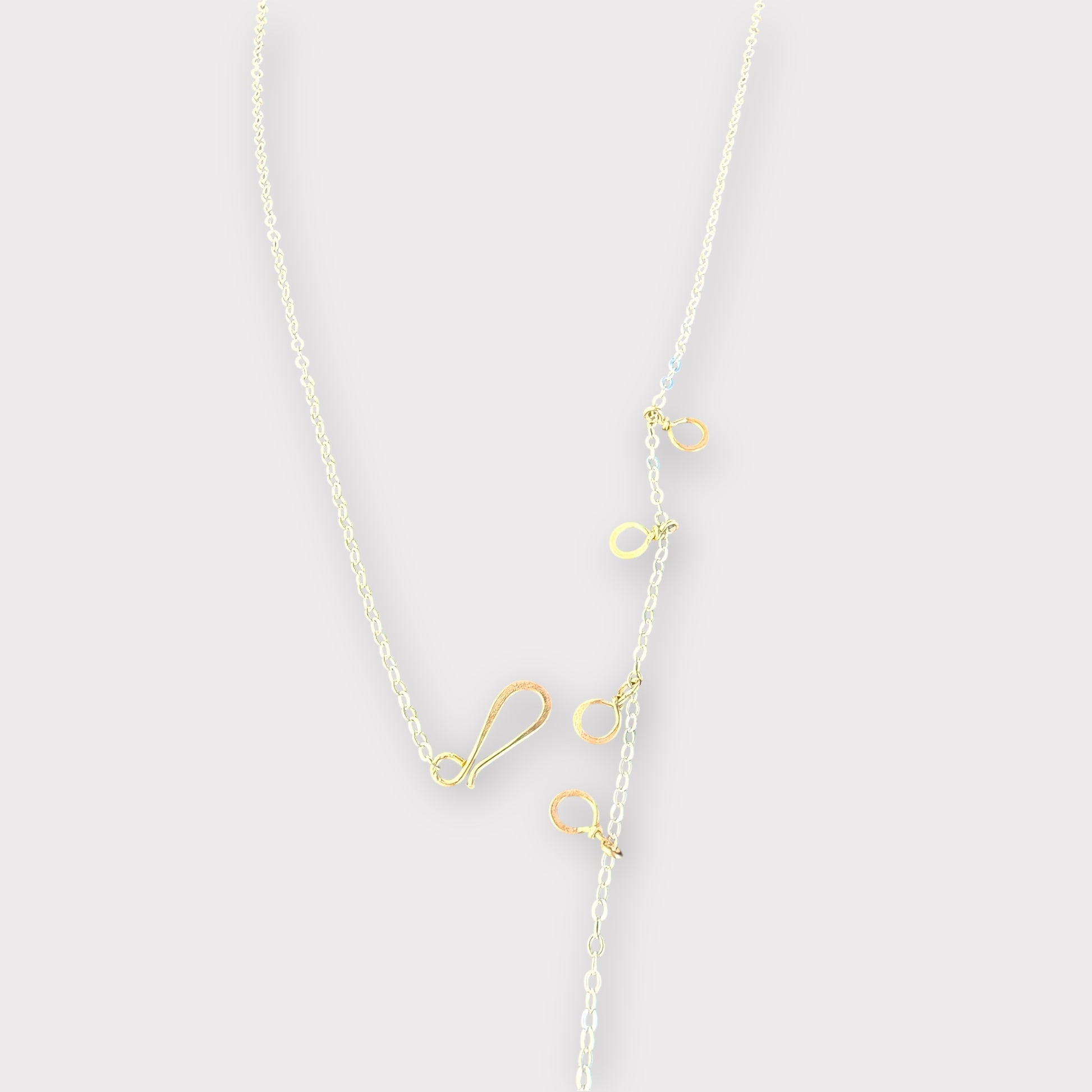 This lariat style necklace is made with a single labradorite stone on 14k gold filled wire on a startling silver chain . Tiny gold ring loops allow the wearer to chain the length of the lariat. 16-20 inches in length. As no two labradorites are alike, slight variations in the flash of colors may occur.