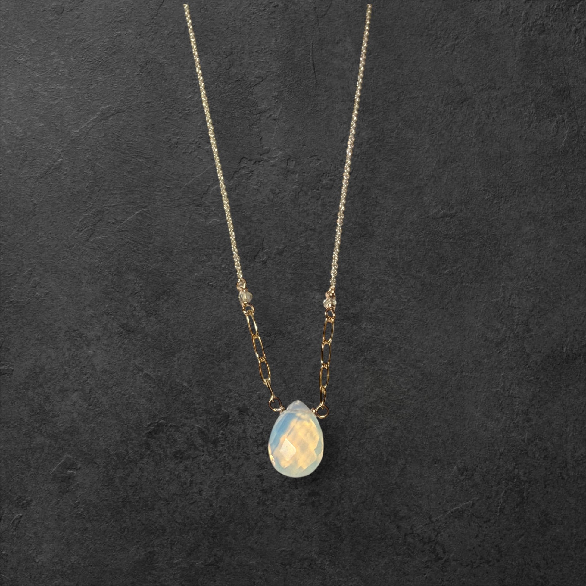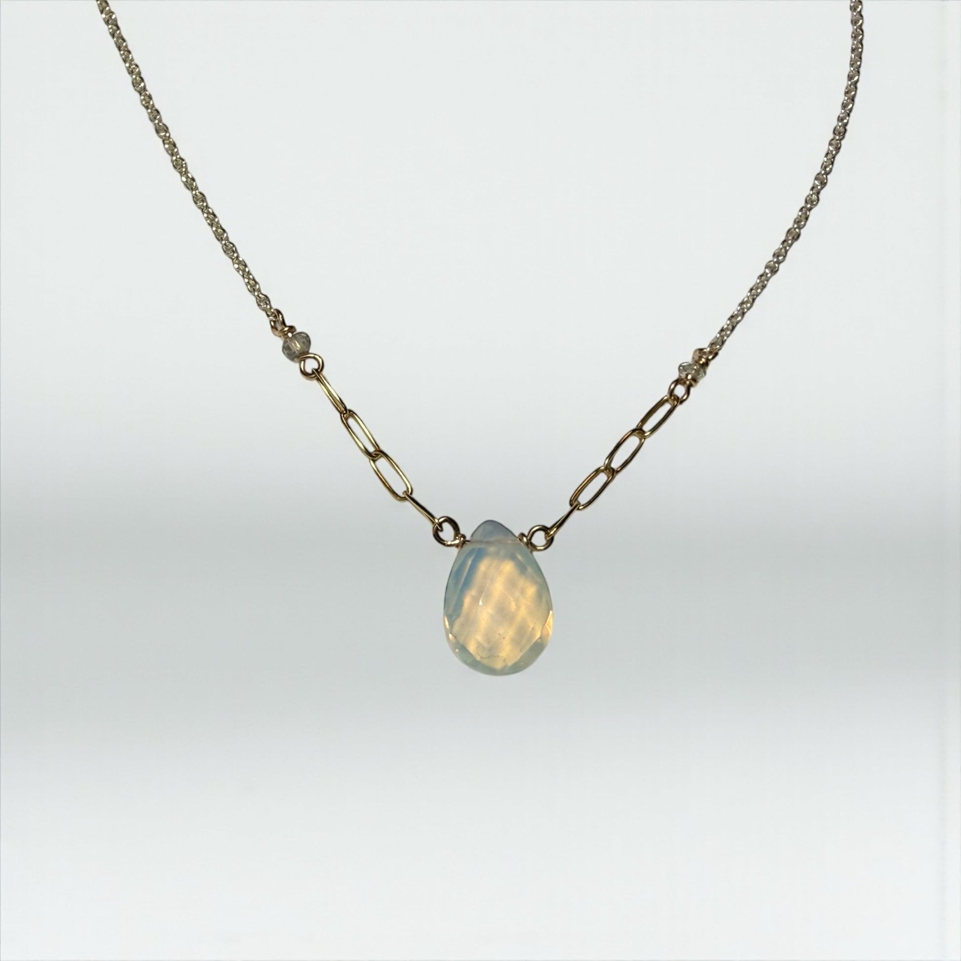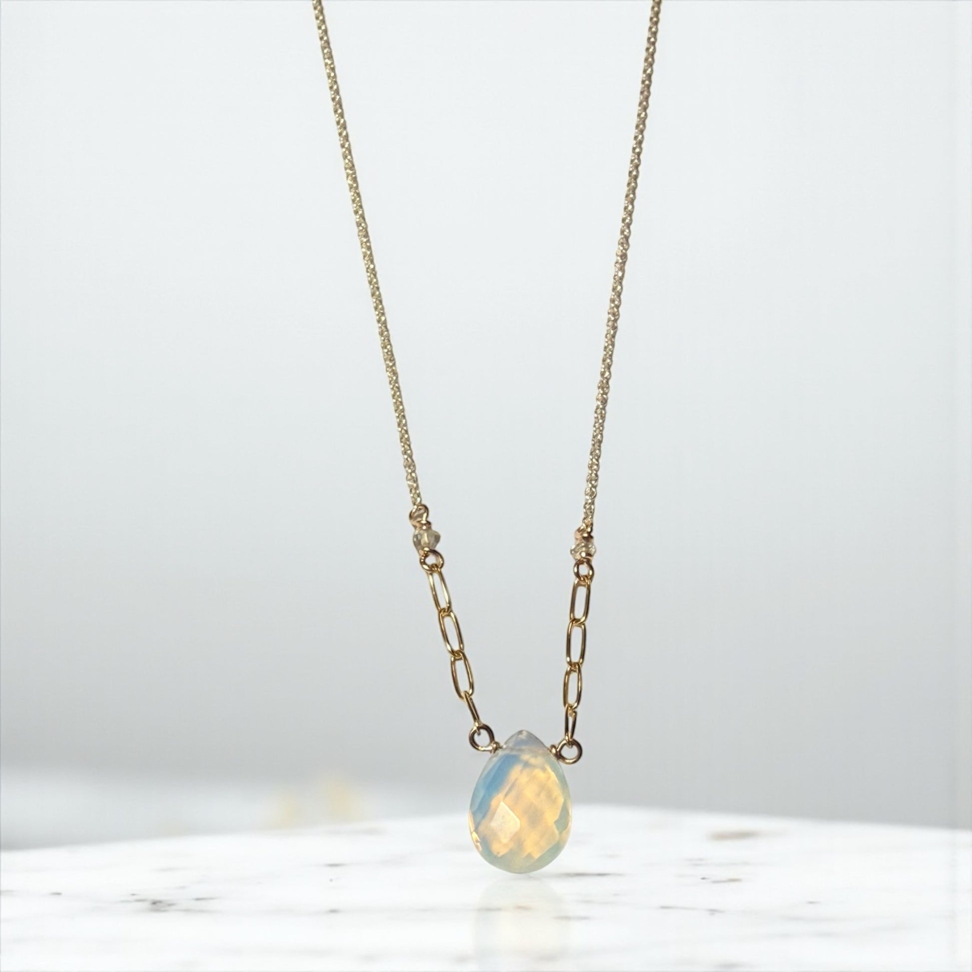 This Opalite necklace is made with combining 14 karat gold filled paper clip chain accented with two tiny Herkimer diamonds. Which are found only in New York State. The sterling silver chain is then made adjustable to allow the wire to adjust from 16 to 18 inches.
